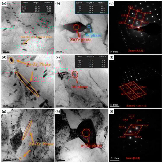 At a strain rate of 0.01 s−1, where the strain rate is relatively low, the microstructure exhibits dynamic recrystallized grains that sufficiently absorb dislocations for nucleation and growth. The diffraction calibration of the orange circled in red in Figure 14g confirms it as having a close-packed hexagonal crystal structure, corresponding to the α-Mg matrix phase. In the microstructure, elongated and granular Zn-Zr phases can still be observed, as shown in Figure 14i. Compared to the strain rate of 0.1 s−1, the quantity of elongated Zn-Zr phases has increased significantly, with relatively longer dimensions, approximately 1–2 μm. Meanwhile, the number of granular phases gradually decreases, and the phases are unevenly distributed within the microstructure. This phenomenon may be attributed to the faster deformation rate at 0.1 s−1, which accelerates the fragmentation of elongated second phases into granular nanoscale second phases, leading to their uneven distribution within the matrix. The fine and dispersed Zn-Zr precipitates can consume Zn dissolved in the Mg matrix, reducing the degree of lattice distortion. This leads to a decrease in the number of newly formed recrystallized grains, allowing the already formed grains more space to grow, resulting in an increase in the average size of the recrystallized grains, which is consistent with the conclusions drawn from the EBSD analysis.