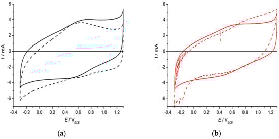 Electrochemical characterization of the as-prepared and exhausted electrode was performed at three randomly selected positions on the electrode’s surface using potentiodynamic polarization, cyclic voltammetry (CV), electrochemical impedance spectroscopy (EIS) and an accelerated stability test (AST). All measurements were performed in a 10% H2SO4 solution in a high-density polyethylene cell, where a platinum electrode was used as a counter electrode and a saturated calomel electrode (SCE) was the reference. All potentials mentioned are in reference to the SCE scale. The working area of the electrode was 1.33 cm2, whereas the working area of the counter electrode was 20 cm2. All measurements were performed using a Biologic—SP 240 potentiostat (BioLogic, Seyssinet-Pariset, France). For anodic potentiodynamic polarization, the scan rate was 2 mV/s. The cyclic voltammetry curves were recorded within a potential window of water stability at a scan rate of 50 mV/s for the 11th steady state cycle. For the EIS measurements, an AC sine signal amplitude of the root mean square of 10 mV was applied around the open circuit potential in a frequency range of 10 mHz–1 MHz. The impedance spectroscopy data obtained were fitted to an appropriate equivalent electrical circuit using ZView® software (version 3.2b).