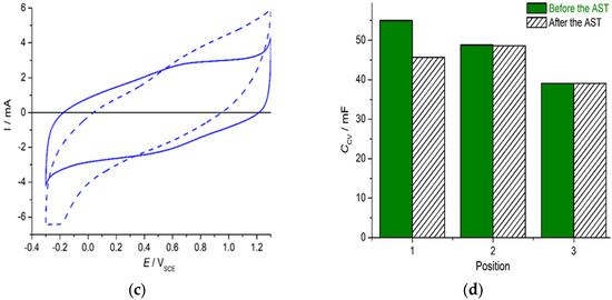 Cyclic voltammograms of IrO2-Ta2O5 coatings on Ti substrate recorded before (full line) and after (dashed line) the accelerated stability test (AST) at positions 1–3 ((a–c), respectively). (d) Voltammetric capacitances calculated from the curves in (a–c).