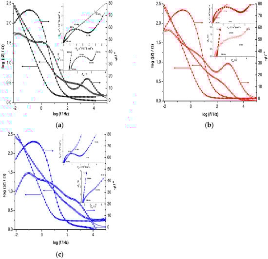 Plots of the EIS data (symbols) of the IrO2-Ta2O5 coating on Ti obtained at the open circuit potential before (full symbols) and after (empty symbols) an accelerated stability test (AST) in 10% H2SO4 for coating surface positions 1 (a), 2 (b) and 3 (c). The responses of the transmission line’s equivalent electrical circuits are shown as lines.