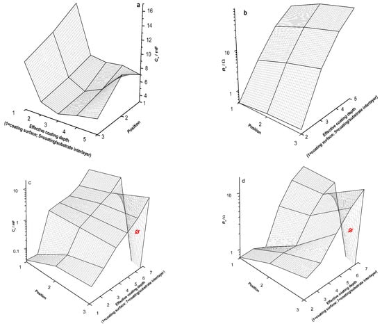 A 3D distribution of the circuit parameter values as a function of the “effective coating depth” (n value) and surface position is presented in Figure 4 for the as-prepared and exhausted coating.