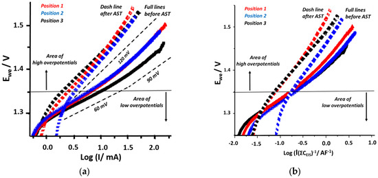 IR drop-corrected (a) and normalized (b) polarization curves for oxygen evolution reaction on IrO2-Ta2O5 coating on Ti obtained before (full lines) and after (dash lines) an accelerated stability test (AST) in 10% H2SO4 at three different coating surface positions.