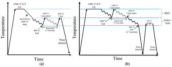 Thermodynamic modeling was performed in ThermoCalc 2024b using the TCFE14 database. This was done to attempt to identify a single phase austenite region for solution treatment and the B2-NiAl stability temperature. Two hot rolling procedures were performed on a rolling mill with a two-high configuration to investigate the effect of thermomechanical processing on B2-NiAl shape and size that started by solutionizing the ingot at 1200 °C for 2 h. Both procedures used hot rolling reductions of 1.02 mm per pass at 12 RPM with 127-mm diameter rolls. A rolling cycle will be defined as four passes totaling 5.08 mm followed by a 5 min reheat to maintain the target temperature range. In procedure 1 (P1), rolling cycles occurred between 1050 and 900 °C to a final thickness of 12.7 mm. Upon reaching the target gauge thickness, the plate was immediately reheated to 1050 °C for three minutes, followed by water quenching. In procedure 2 (P2), rolling cycles occurred between 1200 and 1050 °C to a thickness of 17.8 mm (72% hot reduction). The plate was transferred to a furnace at 1050 °C for five minutes followed by a rolling cycle between 1050 and 900 °C to a final thickness of 12.7 mm followed by agitated water quenching. The P2 plate was subsequently precipitation hardened at 950 °C for 10 min. Schematics for the P1 and P2 conditions are provided in Figure 1.