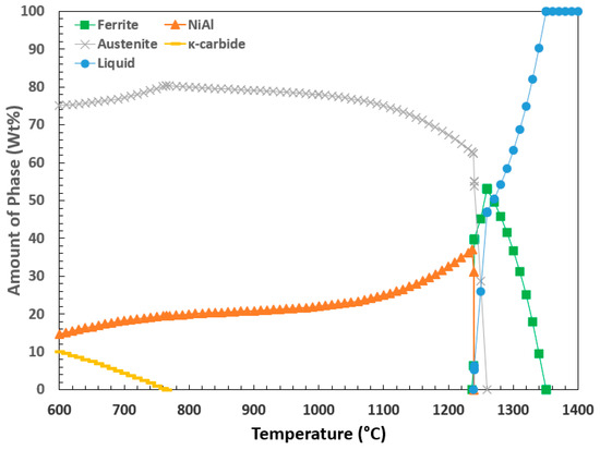 Equilibrium phases as a function of temperature for the 8 wt% Ni steel.