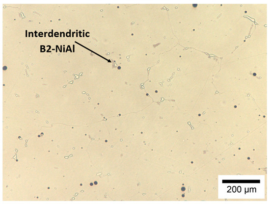 Optical microstructure of the as-cast Fe-21Mn-9Al-1C-8Ni after solution treatment at 1200 °C for 2 h and agitated water quenching. The matrix was primarily austenitic with interdendritic B2-NiAl.