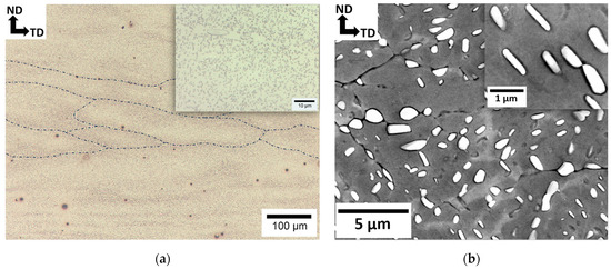Specimens for optical metallography were sectioned with an abrasive saw and polished down to a 0.05 µm finish using standard polishing procedures. Etching was performed with a 10% nital solution. Scanning electron microscopy (SEM) and energy dispersive X-ray spectroscopy (EDS) were performed on a Helios NanoLab 600 at an accelerating voltage of 30 kV and working distance of 4.5 mm. A ThermoFisher Scientific Helios G4 UX DualBeam microscope was used for thinning at 30 kV with a final step at 5 kV, and transmission electron microscopy (TEM) was performed on an JEOL 2100F operated at 200 kV. ImageJ V1.54g was used to measure precipitate size on a minimum of three regions. A minimum of three sub-sized tensile specimens for each processing route with 6 ± 0.1 mm width, 5.95 ± 0.05 mm thickness, and 25 ± 0.1 mm gauge length were prepared parallel to the rolling direction by Electrical Discharge Machining (EDM) and tested at room temperature per ASTM E8 with a strain rate of 0.01 s−1. Charpy V-notch toughness was determined with a minimum of three specimens per orientation using 10 mm × 10 mm × 55 mm (full size) specimens at −40 °C in the L-T and T-L orientations in accordance with ASTM E23.