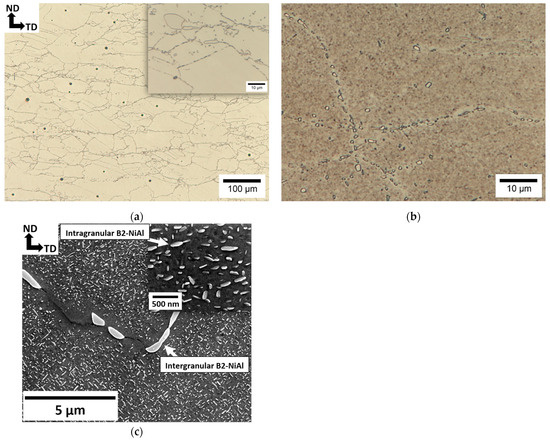 In contrast, hot rolling procedure 2 (P2) was designed to hot roll the majority of the reduction without forming B2-NiAl between 1200 and 1050 °C. The final 5.08 mm of reduction was performed from 1050 to 900 °C to introduce the necessary accumulated strain prior to water quenching for B2-NiAl to nucleate upon. The as-rolled microstructure of the P2 specimen consisted of an austenitic matrix with recrystallized grains and intergranular B2-NiAl present as shown in Figure 5a. This unintended precipitation on grain boundaries was likely a result of the 1050 °C reheat for 5 min prior to the strain building passes where insufficient dislocations were present to nucleate intragranular B2-NiAl. Deformed annealing twins were also observed from deformation induced from the final passes between 1050 and 900 °C. Future investigations would benefit from controlled rolling between 900 and 1200 °C without a reheat cycle to prevent an isothermal hold in a temperature range capable of precipitating B2-NiAl without heterogeneous nucleation sites present from accumulated strain.