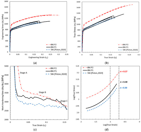 Tensile properties of the current 8% Ni steel in the P1 and P2 conditions, in comparison to a previously reported Fe-18.3Mn-10.1Al-0.9C-4.5Ni steel [42]. (a) The engineering and (b) true stress–strain curves, and (c) the work hardening rate as a function of true strain. (d) The log–log plots of true stress as a function of true plastic strain showing a non-linear behavior.