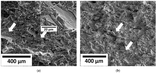 Secondary electron image of the P2 condition in (a) the CVN fracture surface broken at −40 °C in the L-T orientation and (b) the tensile fracture surface. White arrows indicate regions of brittle fracture of austenite grains.
