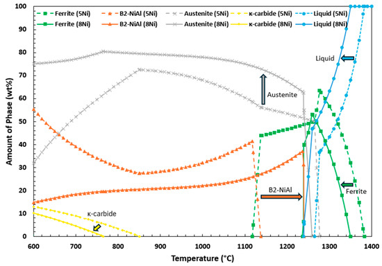 Equilibrium phases as a function of temperature for the 5 wt% Ni (dashed lines) and 8 wt% Ni (solid lines) steels. Arrows indicate the change in equilibrium phases from the 5 wt% Ni to 8 wt% Ni compositions.
