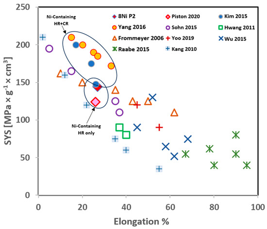Specific yield strength (SYS) as a function of ductility for various low-density Fe-Mn-Al-C steels in comparison to the currently studied P2 specimen. Shaded dots within circled regions represent previously reported Ni-containing Fe-Mn-Al-C steels [40,42,51,52,53,54,55,56,57,58].