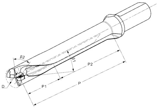 As shown in Figure 1, the main parameters of the designed chip flute are the drilling diameter D , maximum drilling depth P , spiral rotation angle of the spiral flute β 1 , straight flute angle of the straight flute relative to the insert pocket in the direction of the end face β 2 , axial length of the spiral flute P 1 and straight flute length P 2 .