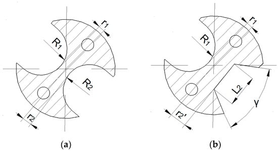 Figure 4 depicts the traditional U-profiled cross-sectional profile of the chip flute and the newly designed combined cross-sectional profile of the chip flute for the 7D indexable insert drill. The U-profiled cross-sectional profile of the chip flute and the newly designed combined cross-sectional profile of the chip flute for the 7D indexable insert drill are depicted in Figure 4. As depicted in Figure 4a, the main parameters of the U-profiled cross-sectional profile were the web thickness of the inner flute r 1 = 0.98 mm, the web thickness of the outer flute r 2 = 1.78 mm, the arc radius of the bottom of the inner flute R 1 = 4 mm, the arc radius of the bottom of the outer flute R 2 = 4 mm and the opening angle γ = 46.5°.