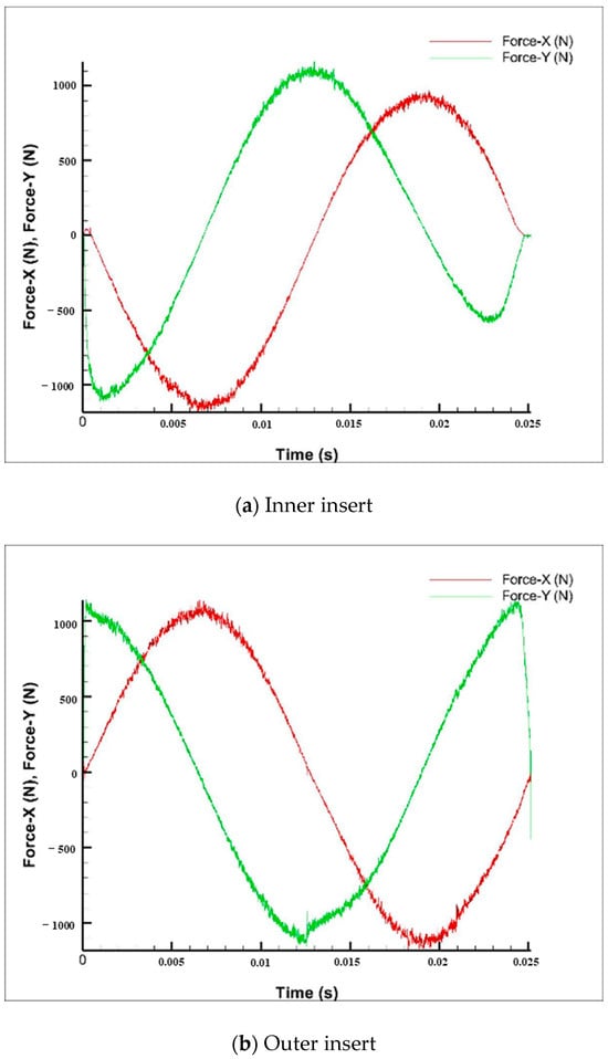 The cutting force of the 42CrMo material processed under the same cutting conditions was obtained, as shown in Table 5. In this simulation, which is concerned with the steady-state cutting forces during the continuous rotation of the cutting tool, the resultant force F remains constant. The forces in the x and y directions, denoted as Fx and Fy, will change with the variation in the rotation angle. Therefore, the simulated components Fx and Fy will exhibit changes over time. At t = 0.006 s (when the workpiece is cut to 90 degrees), the resultant force values for the inner and outer inserts are tabulated in Table 5.