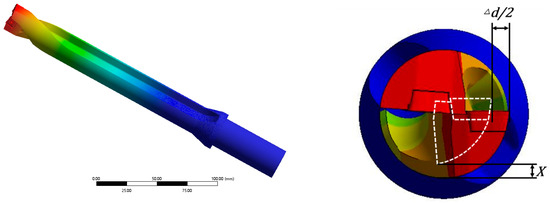 When the radial cutting forces data in Table 5 are applied to drill stands with various flutes, the deflection of the indexable insert drill is shown in Figure 8. The white dotted line on the right indicates the position of the insert before deflection deformation.