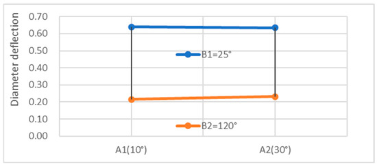 Figure 9 shows that the diameter deflections for A 1 B 1 and A 2 B 1 were not good, while the average diameter deflections for A 1 B 2   a n d   A 2 B 2 were small. The small helix angle was easier to machine. The specific product A 1 B 2 means a higher production yield and lower manufacturing costs compared to A 2 B 2 . Therefore, the optimal level condition parameter A 1 B 2 C 1 D 2 was obtained.