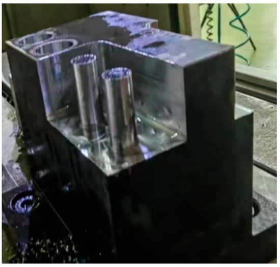 The indexable insert drill experiment was carried out on a Qinghai XH768G horizontal machining center. The designed indexable insert drills and the hole-making site are shown in Figure 10 and Figure 11, respectively.