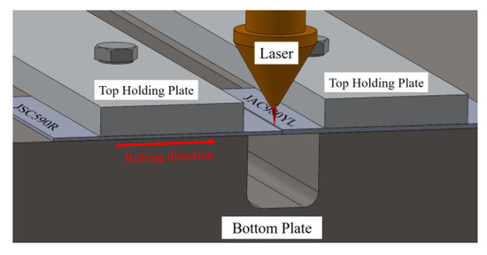 The JHM-4GX-300 pulsed laser, manufactured in Germany supplied by Shanghai University of Electric Power, was employed in laser welding tests of dissimilar steels of differing thickness. The laser wavelength was set to 1064 um, the diameter of the fiber was set to 200 um, and the maximum output power was 300 W. A schematic of the welding process is shown in Figure 2.