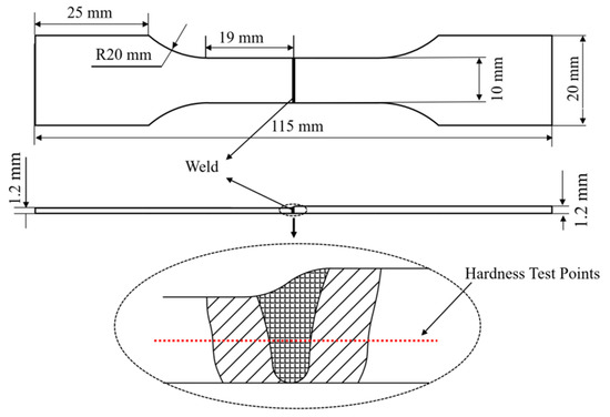 After the test was completed, a metallographic specimen of the welded head was prepared using the hot-setting method. Following grinding and polishing, the specimen was corroded using a 4% nitric acid–alcohol solution. The macromorphology and microstructure of the metallographic specimens were observed using a Leica CTR6 LED optical microscope. A hardness test was conducted on a section of the joint using a Buehler Wilson VH1102 micro Vickers hardness tester. The test positions are shown in Figure 3. The distance between adjacent hardness points was 150 um, the load pressure was 300 g, and the holding time was 10 s. The tensile specimens were prepared in accordance with the GB/T 228.1-2021 standard [25], as shown in Figure 3. The tensile properties of the base material and welded joints of the JSC590R and JAC980YL steels were then tested using an electronic universal material testing machine at a tensile rate of 2 mm/min. All the above chemicals & reagents, devices, instruments are provided by Shanghai Intelligent Manufacturing R&D and Transformation Functional Platform(Building 3, Lane 99, Ocean Road 4, Lingang section of Shanghai Pilot Free Trade Zone, Shanghai, China).