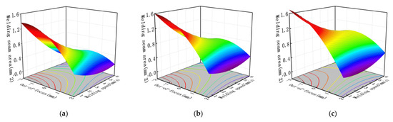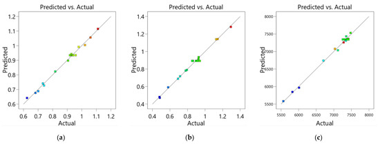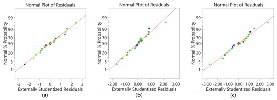 The above model was tested by analyzing the distribution of the residuals in Figure 4 and the comparison of the actual and predicted values in Figure 5. The results showed that the data points of the model’s residuals and the actual and predicted values were distributed around the 45° line, suggesting that the model was more stable and had a higher level of credibility within the given range. The p-value is a probability value, with a lower value indicating more evidence that negates the original hypothesis. This was used to indicate the significance of this source of variance in the response surface model. A p-value of less than 0.05 is considered significant, a p-value of less than 0.01 is regarded as highly significant, and a p-value of less than 0.001 is considered extremely significant [26].