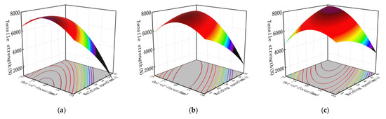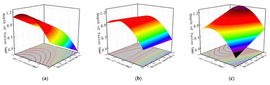 The response surface model was analyzed using the Design-Expert 13 software, and a regression equation was used to plot the three-dimensional (3D) response surface. This was used to investigate the effects of various factors on the joint quality. Figure 6 shows that to achieve a greater depth of fusion, it is necessary to control the out-of-focus amount to be around -0.04 mm, to vary the welding speed at different single-pass heat inputs, and to continue to strive for a maximum depth of fusion of 1.1 mm at a single-pass heat input of eight J. Figure 7 shows that, concurrent with the out-of-focus amount and welding speed parameters, the greater the single-pass heat input, the larger the weld area. The weld area consistently affected the quality of the joints at single-pass heat inputs of seven J, eight J, and nine J. The data for seven J, eight J, and nine J demonstrated a consistent pattern: as the out-of-focus amount and welding speeds decreased, the weld area exhibited an increasing trend. Figure 8 shows the influence of the interaction between the out-of-focus amount and welding speeds on the tensile force at various heat inputs. The 3D surface slope in Figure 8a is greater than those in Figure 8b,c, indicating that the tensile force is more sensitive to changes in the out-of-focus amount and welding speed at seven J. The lowest value of the tensile force was less than 2000 N. Consequently, to achieve a greater tensile force, it was essential to ensure that the low heat input was matched with a lower welding speed. Concurrently, to achieve a greater tensile strength, a low single-pass heat input must be matched with a slower welding speed, while a high single-pass heat input must be matched with a faster welding speed.
