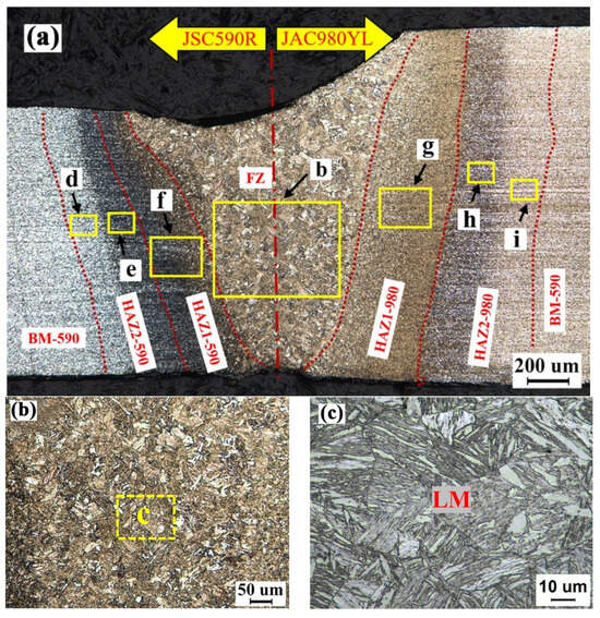 The results of the response surface test indicated that the following optimized pulse welding parameters should be employed: an out-of-focus amount of −0.13 mm, a welding speed of 4.5 mm/s, and a single-pass heat input of nine J for the welding test. Figure 9a shows the macroscopic morphology and local microstructure of the welded joints, which exhibits a distinct demarcation line. This line serves as a reference, demarcating the center line of the weld, and the left and right side of the JSC590R and JAC980YL steel joints, respectively. As the distance from the center of the seam increases, the joints can be divided into the weld zone (fusion zone, or FZ) and heat-affected zone (HAZ). The HAZ can be further divided into two subzones: HAZ1 and HAZ2. HAZ1 contains coarse and fine crystal zones, while HAZ2 contains an incomplete phase transition zone and tempering zone. A comparison of the width of each HAZ revealed that the JAC980YL steel was wider than the JSC590R steel. This is attributed to the inferior heat dissipation properties of the JAC980YL steel compared to those of the JSC590R steel. The martensite content and thickness of the JAC980YL steel were greater than that of the JSC590R steel, which reduced the thermal conductivity of the material. Consequently, JAC980YL steel has a greater capacity to withstand elevated temperatures than JSC590R steel, facilitating the growth of internal structures.