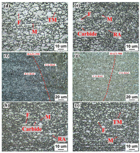 Macroscopic morphology and local microstructure of welded joints: (a) macroscopic morphology of welded joint, (b) FZ of welded joint, (c) lath martensite in weld zone, (d) S-C HAZ of JSC590R, (e) I-C HAZ of JSC590R, (f) F-G HAZ and C-G HAZ of JSC590R, (g) C-G HAZ and F-G HAZ of JAC980YL, (h) I-C HAZ of JAC980YL, (i) S-C HAZ of JAC980YL (F: ferrite, M: martensite, LM: lath martensite, RA: retained austenite, TM: tempered martensite).