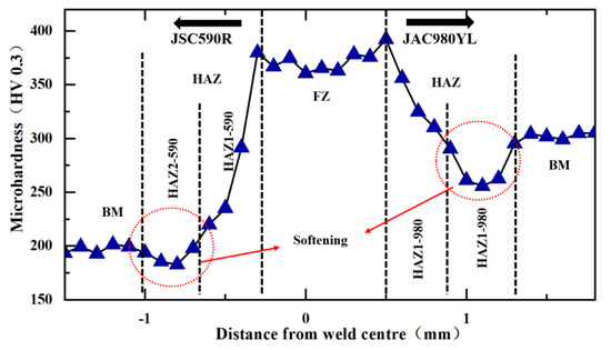 Figure 10 shows that there is a significant difference in the hardness of the different regions of the welded joints. The average hardness of the JSC590R steel-based material is 197 HV. There is a softening zone in the HAZ on the side of the JSC590R steel. The hardness was approximately five percent lower than that of the base material, and its width was approximately 0.25 mm. The distribution of softened areas in HAZ2-590 was based on microstructure observations. This is because the martensite in the tempering zone in this region underwent tempering decomposition to form tempered martensite. The incomplete phase transition zone in the ferrite increased, while the martensite content decreased, thus lowering the hardness of HAZ2-590 relative to the base material. Subsequently, there was a notable increase in the hardness of the HAZ in HAZ1-590, specifically at the coarse crystal and weld zone boundaries. This reached a maximum value of 380 HV, with the weld zone exhibiting an average hardness of 378.4 HV. The base material of the JAC980YL steel exhibited a hardness value of 303 HV, while the HAZ exhibited a hardness value of 378.4 HV. The distribution pattern of the HAZ hardness was similar to that of the JSC590R steel. However, the decline in the softening zone (HAZ2-980) hardness was more pronounced than that in the parent material, with a decrease of approximately 13%. This is because the JAC980YL steel is thicker, resulting in poorer heat dissipation and a greater amount of tempered martensite, leading to a more pronounced hardness drop [29,30,31,32,33].