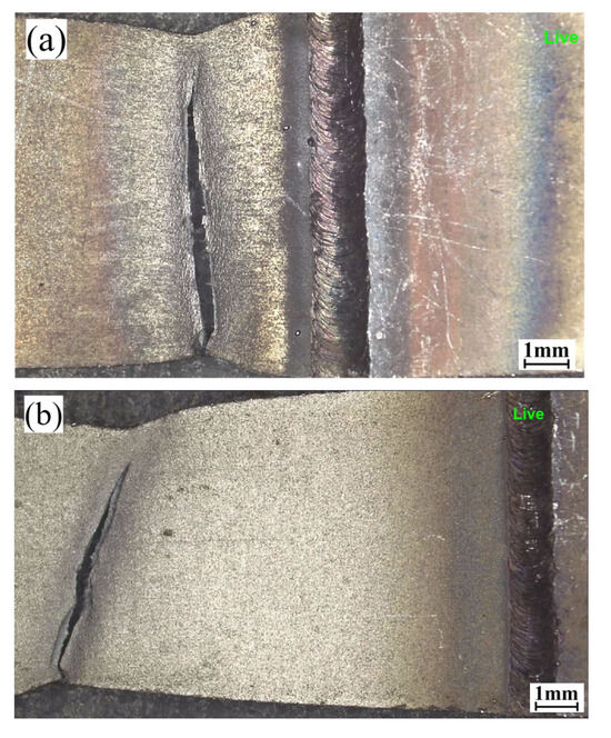 Tensile fracture areas of welded joints. (a) Tensile fracture area of welded joint before optimization; (b) Tensile fracture area of welded joint after optimization.