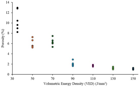 | Sample | Laser Power (W) | Scanning Speeds (mm/s) | Porosity (%) | VED (J/mm3) | VED *eff (J/mm3) | VED **eff (J/mm3) |