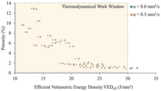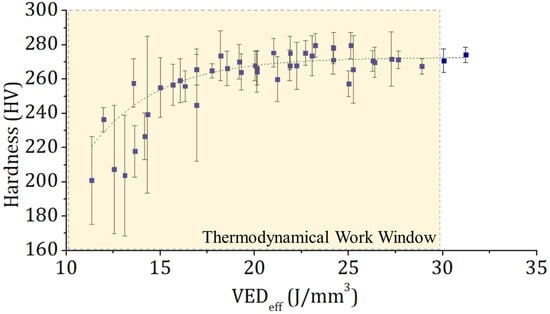3.4. Optimization of the Processing Parameters by Using VED, VEDeff and Thermodynamical Work Window