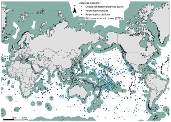 Location of deep-sea deposits and their spatial overlay with the exclusive economic zones. Reprinted with permission from ref. [16]. 2021 Elsevier.