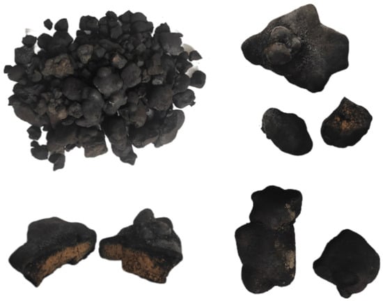 The manganese nodules in this study were obtained from the southeastern coast of China in the Western Pacific Ocean during sea trials by the Changsha Institute of Mining and Metallurgy. As shown in Figure 2, the color of manganese nodules is often black or brown-black, and the shapes are mostly spherical, elliptical, potato-shaped, flat, slag-shaped, etc., with different sizes. It can be observed that the manganese nodules are composed of a loose core and a dense shell after cutting the manganese nodules in half, which is consistent with relevant reports. The main minerals of manganese nodules are cryptocrystalline iron-hydroxide manganese ore (δ-MnO2·H2O) and amorphous ferrihydrite (FeOOH), which are usually epitaxially intertwined [29,30,31]. The rest of the minerals are fine-grained clastic minerals, including quartz, feldspar, pyroxene, clay, zeolite, and authigenic mineral carbon fluoroapatite (CFA). The elements in manganese nodules in the Pacific can be roughly classified according to their mass fractions, as shown in Table 1. The element contents indicate that the metal elements with greater economic value in deep-sea manganese nodules are mainly Mn, Fe, Ni, and Co, followed by Cu, etc. [32,33,34].