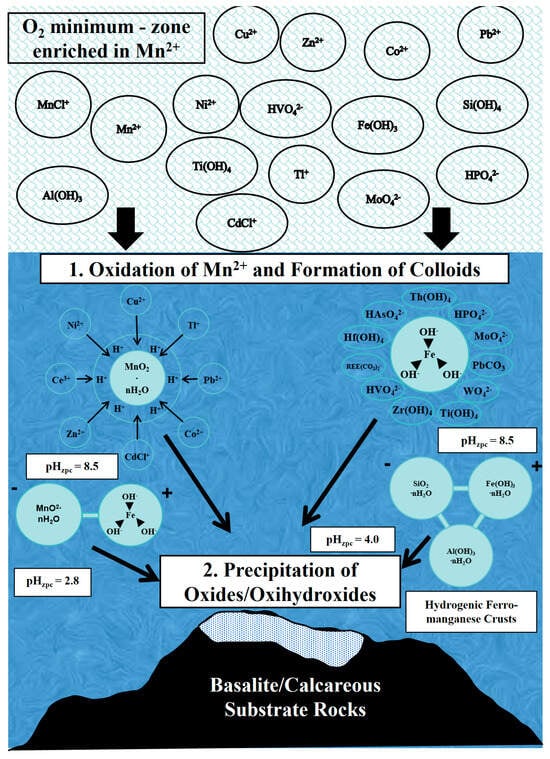 Further chemical analysis results (Table 3) indicate that the contents of Mn, Fe, Ni, Co, and Cu are 24.68%, 7.85%, 1.05%, 0.23%, and 0.92%, respectively. Coupled with the phase analysis results (Table 4, Table 5 and Table 6), it can be concluded that Mn mainly exists in the aggregate of manganese iron oxides, accounting for 65.23%, followed by 27.81% of manganese dioxide, 6.19% of manganese oxide and 0.76% of manganese silicate minerals. More than 99% of Co and Ni are distributed in manganese oxides, which is related to the formation mechanism of manganese nodules. During the formation of manganese nodules, Co2+ in seawater is adsorbed by the negatively charged hydrated MnO2 colloid under the action of external coordination adsorption and oxidized to Co3+. Ni2+ is also fixed on MnO2 through adsorption. Therefore, the distribution of Co and Ni is positively correlated with Mn. However, iron oxyhydroxide that is positively charged is easily adsorbed by certain hydrated metal ions that are negatively charged. The distribution of these metal elements is positively related to Fe and mainly includes Pb, V, As, Mo, W, Ti, Th, Zr, rare earth elements (REE), etc. [36,37,38,39,40]. The formation mechanism of manganese nodule is shown in Figure 3, which illustrates the co-occurrence relationship between various elements.