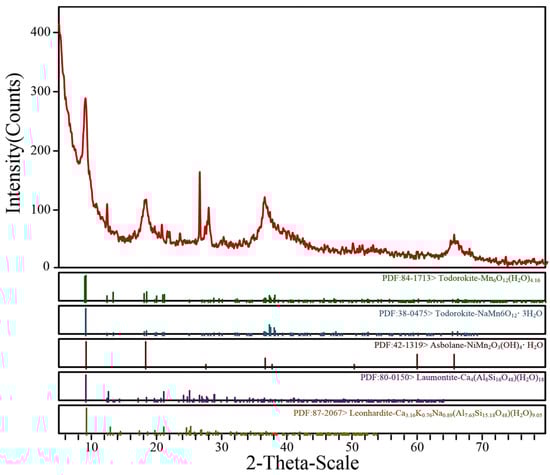 As can be seen from Figure 4, the intensity of the XRD peak of the manganese nodule is very weak, and amorphous minerals such as vernadite are difficult to detect, which is consistent with the relevant research findings. However, hydromanganese mineral groups, such as todorokite and asbolane, and zeolite mineral groups, such as laumontite and leonhardite, can still be observed [41,42].
