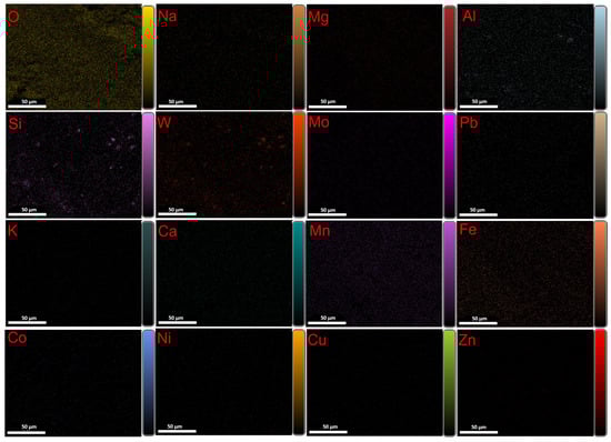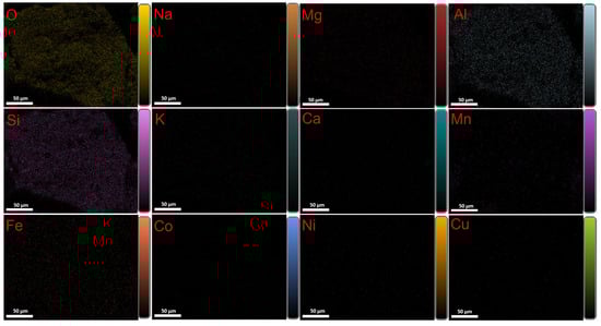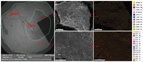 The distribution status of the main elements in manganese nodules were investigated in detail using Multimode V scanning microscope. As shown in Figure 5, the dense shell and loose core of the cross-sectioned manganese nodule under the microscope show obvious boundaries. An area in the core and shell is randomly selected for surface scanning to analyze the content and distribution of the elements, respectively. The results show that the main element contents in the core from high to low are: O (34.28%), Si (27.36%), Fe (13.95%), Al (9.35%), Mn (5.60%), K (2.81%), Mg (2.53%), Ca (1.10%), Na (1.09%), Cu (0.72%), Ni (0.68%), Co (0.54%), the main elements in the shell are Mn (34.59%), O (27.81%), Fe (15.10%), Si (5.13%), Mo (4.71%), Ca (2.54%), Al (2.42%), Mg (2.19%), Ni (1.36%), Na (0.88%), Cu (0.86%), K (0.68%), Zn (0.61%), W (0.57%), Co (0.49%), and Pb (0.05%). The contents of Si and Al in the core significantly exceed those in the shell, and the distributions of Al and Si in the core are closely related (Figure 6), indicating that the main minerals in the core are aluminosilicate minerals such as feldspar, pyroxene, clay, zeolite, etc. The contents of Mn and Fe in the shell are much higher than those in the core, and the Mn and Fe in the shell are highly dispersed (Figure 7), indicating that the main mineral in the shell is the iron–manganese mineral phase. The main valuable metal elements Ni, Co, and Cu are scattered in the core and shell of nodules. Comparing the content of each element in the core and the shell, when the content of Mn and Fe is high, the content of elements related to them is also high, which is consistent with the research results on the formation mechanism of manganese nodules.