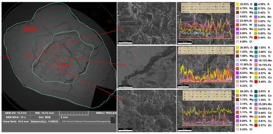 Line scans were performed on different areas of manganese nodules to further study the changes in the content of each element. As presented in Figure 8, the change pattern of element characteristic peak intensity also proves that Al and Si are closely associated, and Fe and Mn are closely associated. From the core to the shell, the contents of Al and Si gradually decrease, while the contents of Fe and Mn gradually increase.