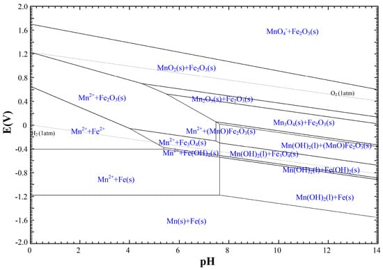 Potential–pH diagram for Mn–Fe–H2O system at 25 °C and unit activity (based on HSC Chemistry 6.1).