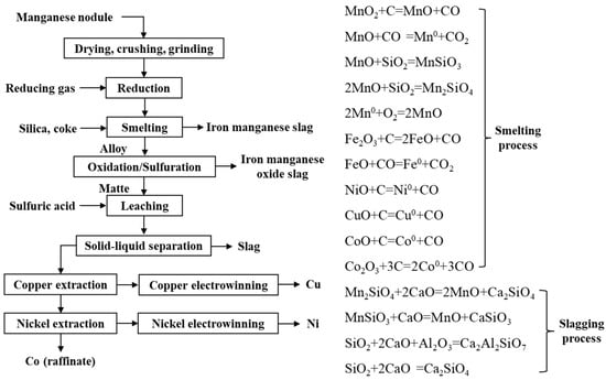 (2) Improved INCO process. Based on the INCO process, China Ocean Mineral Resources Research & Development Association (COMRA) has made improvements to the subsequent hydrometallurgical leaching of polymetallic alloys. The hydrochloric acid corrosion method was employed to precipitate most of the iron, while copper, cobalt, nickel, and manganese enter the solution. The metals were then extracted and separated. In small-scale trials, the metal recovery rates were as follows: 94.21% of Cu, 95.23% of Co, 96.49% of Ni, 97.68% of Mn, and 96.16% of Fe [53]. Similarly, Interoceanmetal Joint Organization (IOM) employed H2SO4-H2SO3 instead of H2SO4 to dissolve the alloy of copper, nickel, and cobalt produced by electrosmelting. Nickel, cobalt, and a small amount of manganese and iron were selectively dissolved, while copper precipitated as CuS. The manganese-rich slag generated during electrosmelting was recovered in the form of Si-Mn alloy. Ultimately, the recovery rates of Cu, Ni, and Co can reach 92%, 93%, and 89%, respectively [54].