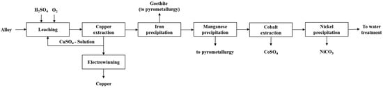 - Keber, S.; Brückner, L.; Elwert, T.; Kuhn, T. Concept for a Hydrometallurgical Processing of a Copper-Cobalt-Nickel Alloy Made from Manganese Nodules. Chem. Ing. Tech. 2020, 92, 379–386. [Google Scholar] [CrossRef]