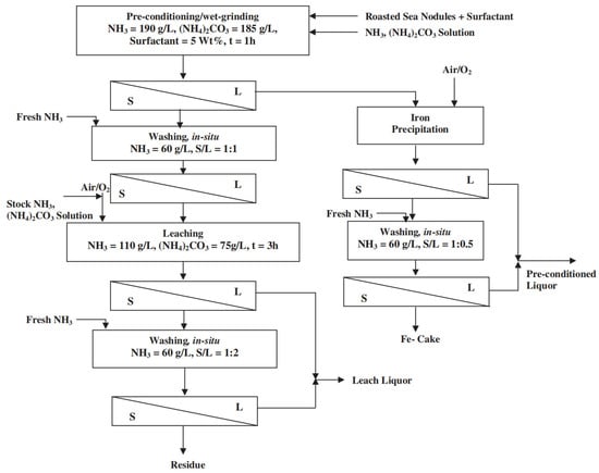 India’s National Metallurgical Laboratory (NML) has also been dedicated to improving the metal recovery rates of the reduction roasting–ammonia leaching process. The study revealed that excessive reduction roasting can lead to the formation of alloys between iron and nickel or cobalt. These alloys hindered the reaction between the leaching reagent and nickel or cobalt, resulting in a decrease in extraction efficiency. Therefore, it was essential to select appropriate roasting temperatures and durations. Another factor contributing to low leaching rates was that as the leaching time extends, the small amount of Cu (NH3)2+ that was released rapidly elevated the system’s redox potential, causing the precipitation of iron and manganese. The recovery rates of nickel and cobalt decreased due to co-precipitation/adsorption, especially cobalt [60,61]. Improvements in extraction efficiency have been achieved by employing a two-stage ammonium leaching process using high-concentration ammonium solution followed by low-concentration ammonium solution, while strictly controlling the redox potential in the first-stage leaching system. However, the high iron content in the leaching solution was not favorable for the subsequent extraction and electrowinning for purifying the various metals. Therefore, the recovery rate of Co needed to be sacrificed for the rationality of the entire process. After 16 leaching cycles, the recovery rates of Cu, Ni, and Co reached 92%, 90%, and 56% [62]. In order to improve the recovery rate of Co, Mishra et al. introduced anionic surfactants in the pretreatment process of roasted manganese nodules, which reduced the adsorption of Co on the ferromanganese precipitate and achieved an impressive average metal recovery rates of 92.5% of Cu, 91.5% of Ni, 71.35% of Co [63]. The optimized process is shown in Figure 12. In order to study the interactive influences of the leaching behavior of various metals in NH3-CO2 solution after the reduction roasting of manganese nodules, Jana et al. used metal powders of copper, nickel, cobalt, manganese, and iron to simulate ammonia leaching experiments. The results showed that, in the absence of iron and manganese, the combined leaching behavior of copper, nickel, and cobalt was the same as their individual leaching behaviors. However, when manganese was added, the leaching of each metal decreased. The reduced recovery rate was due to the reducing atmosphere caused by the hydrogen gas produced when metallic manganese reacted with the ammonia solution to form an aminomethanoate compound. The presence of iron alone had little effect on the leaching behavior of copper, nickel, and cobalt. In the actual leaching of manganese nodules after reduction roasting, the recovery of copper was still satisfactory (97%), while the recovery of nickel and cobalt were lower. The high recovery of copper may be due to the fact that the metallic manganese in the nodules after reduction roasting was still less than the oxidized manganese, which cannot create a reducing atmosphere by generating hydrogen. Additionally, when preconditioned in the presence of air, a passivation film formed on the surface of the iron–cobalt and iron–nickel alloys, inhibiting the dissolution of cobalt and nickel into the solution. By conducting the pretreatment in an air-free environment and then leaching in the presence of air, the formation of the passivation film can be avoided, and iron can quickly precipitate in the initial stage of leaching, improving the recovery of nickel and cobalt [64].
