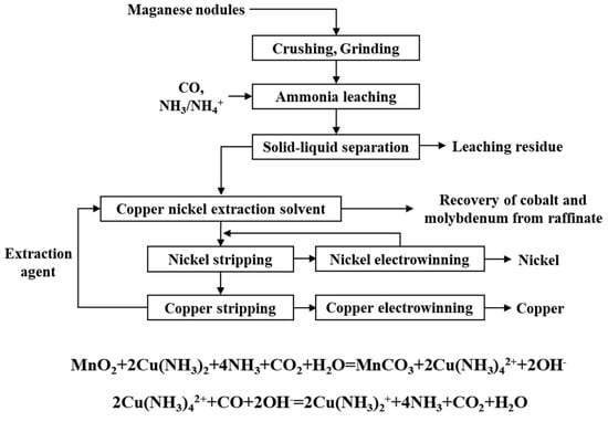 KCC initially employed the ammonia leaching process to extract valuable metals from manganese nodules, known as the Cuprion process. As presented in Figure 13, Cu(II) in the solution was reduced to Cu(I) by CO, and then Mn(IV) was reduced to Mn(II) by Cu(I). Copper, nickel, and cobalt formed soluble complexes with ammonia, while manganese and iron formed carbonates and precipitated into the leaching residue. Subsequently, a solvent extraction–electrowinning method was employed to produce copper and nickel, followed by the recovery of cobalt and molybdenum from the raffinate. The process had mild reaction conditions and good selectivity, but it also had disadvantages such as low cobalt recovery (50%), low pulp concentration, and the potential hazards associated with CO [65,66]. Other reductants have been introduced to improve the Cuprion process include glucose [67], manganese ions [68], ferrous sulfate [69], elemental sulfur [70], sulfur dioxide [71], ammonium thiosulfate, and ammonium sulfite [72]. The subsequent separation and purification of valuable metals in the leachate and leaching residue also adopted conventional metallurgical methods such as solvent extraction and precipitation [73,74].
