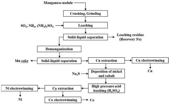 The National Institute for Resources and Environmental Research (NIRE) in Japan combined the advantages of NH3-CO and NH3-SO2 processes to leach manganese nodules and cobalt-rich crusts in solutions of (NH4)2CO3 and (NH4)2SO3. During the leaching process, the dissolved Mn, Fe, and CO32− formed precipitates into the residue, and then Cu and Ni were simultaneously extracted from the leachate. Finally, methanol was added to the leachate containing Co, (NH4)2CO3, and (NH4)2SO4 to precipitate cobalt, and the remaining leachate was recycled [50,75].
