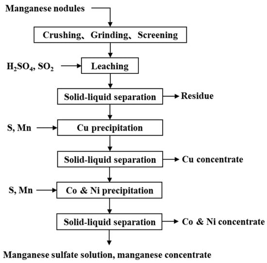 Sulfuric acid is also widely used as an acidic medium for reduction leaching of manganese nodules. IOM has conducted extensive research on sulfuric acid leaching of manganese nodules from CCZ. As shown in Figure 15, the main operations were as follows: (I) preliminary grinding of wet raw materials in a ball mill to reach 86% particles of −0.2 mm; (Ⅱ) selective leaching of Cu, Ni, Co, and Mn under normal pressure containing SO2, thickening of the leached pulp with flocculant, and filtration of the underflow of the thickener; (Ⅲ) selective precipitation of Cu from the leachate by introducing active sulfur powder and feeding of sulfuric anhydride to the reactor under normal pressure; (Ⅳ) precipitation of Ni and Co concentrate by introducing powdered sulfur and metallic manganese; (Ⅴ) precipitation of MnO2 during the neutralization reaction with ammonia water, thickening, filtration, washing of filter with manganese hydroxide concentrate, drying in a rotating furnace, and briquetting [81,82].