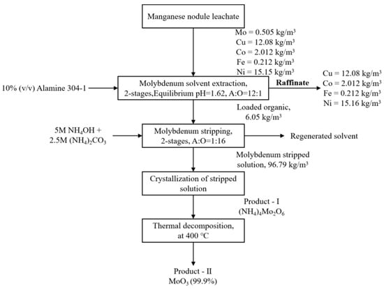 - Parhi, P.K.; Park, K.-H.; Kim, H.-I.; Park, J.-T. Recovery of molybdenum from the sea nodule leach liquor by solvent extraction using Alamine 304-I. Hydrometallurgy 2011, 105, 195–200. [Google Scholar] [CrossRef]