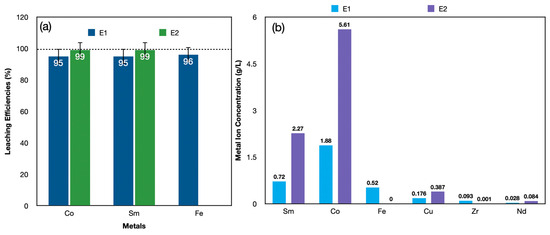 Leaching efficiencies (a) and metal ion concentration of leachates (b).