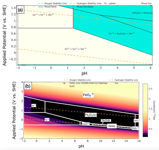 The Pourbaix diagram of Sm, Co, and Fe (a) and the heat map of FeHO2 GGA + U) (b) (drawn with The Materials Project) (Adapt from [19,20,21]).