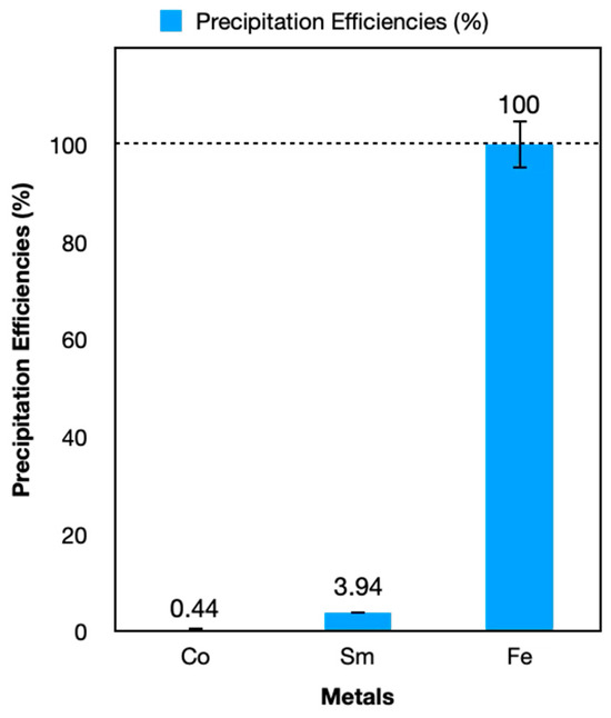 The presence of Fe ions in the solution has an impact on the purity of the resulting precipitate. The precipitation of impurity ions, including Fe3+, Al3+, and Ca2+, at pH values greater than 3–4 facilitates the purification of the leach solution from impurities [22]. In this study, to remove impurity ions in the solution, the pH value of the leaching solutions was increased to 4 before selective REE precipitation with NH4HCO3, and in particular, the high concentration of Fe ions, obtained after the E1 leaching reaction, was removed from the solution via precipitation. In Figure 4, the precipitation efficiencies of Sm, Co, and Fe ions at pH 4 from the E1 leaching solution are presented. At a pH of 4, the Fe ions were almost completely removed from the solution, while the loss of Sm and Co was calculated to be 0.44% and 3.94%, respectively. While Fe ions and other impurity ions precipitate, even if the pH range of the precipitation does not correspond to that of the REEs ions, these ions precipitate together with the impurities or can adsorb onto the surface of precipitated impurity complexes [23].