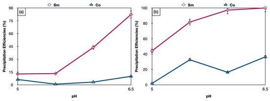 REEs can be easily precipitated by carbonate at high pH values, and carbonates are ideal precipitants due to their easy availability, low cost, and easy dissolution in mild acids for subsequent purification; however, since precipitation is difficult in acidic environments, a neutralization process is applied to the leach solution before REE precipitation, and during this process, impurities such as Fe3+ and Ca2+ are primarily precipitated, which may lead to the loss of REEs through adsorption and co-precipitation with oxides or complexes [14]. To precipitate REE carbonate complexes under mild acid conditions and remove impurities, the pH value in both solutions was adjusted to 4 and then precipitated with NH4HCO3. It is appropriate to utilize NH4HCO3 as a precipitating agent for REEs. In addition to providing a carbonate source for complexation with REEs, it serves as a pH adjuster compared to other agents that offer carbonate sources [15,24]. REEs precipitate as REE carbonates (RE2(CO3)3) with Equation (3) in the pH range of 7–8 [15]. However, the cobalt carbonate precipitate formation reaction occurs in the pH range of 6.5–8 [24]. To achieve selective precipitation of Co and Sm, precipitation was conducted within a pH range of 5–6.5. Sm and Co precipitation efficiencies from solution E1 in the pH range of 5–6.5 are given in Figure 5a. An increase in pH value from 5 to 6.5 resulted in a notable enhancement in the precipitation efficiency of Sm, with a significant rise from 12.75% to 82.37%. Nevertheless, during the selective precipitation process, some Co was also precipitated via co-precipitation or the adsorption of the formed Sm complex precipitates. Increasing the pH from 5 to 6.5 in solution E1 increased the Co-precipitation rate from 6.25% to 10%. Although this increase was attributable to the approach of the precipitation pH range of Co, no notable distinction was discerned between pH 5 and 6.5. Sm and Co precipitation efficiencies with NH4HCO3 from E2 solution (in the pH 5–6.5 range) are given in Figure 5b. The precipitation efficiency of the Sm carbonate was found to be 44.28% at pH 5, with the precipitation of all Sm ions in the solution occurring at pH 6.5. The Co-precipitation rate was observed to be 1.89% at pH 5 and 36.43% at pH 6.5. This considerable enhancement in the rate of Co-precipitation is contingent upon the Eh value of the system. At elevated temperatures, the solution obtained through leaching with HNO3 (E2) exhibits enhanced oxidizing properties [7]. It was observed that increasing the oxidizing properties of the solution increased the Co-precipitation rate with increasing pH.