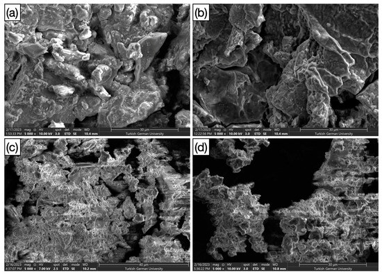 Figure 6 illustrates the SEM images of the precipitates that were formed from the E1 and E2 solutions at pH values of 5 and 6.5, respectively. It was observed that the precipitates exhibited an irregular shape and agglomeration, similar to that observed in the particles obtained as a result of REE precipitation with NH4HCO3 in the literature. It was observed that the precipitates obtained from the solution with more oxidative conditions exhibited a particle size distribution that was smaller.